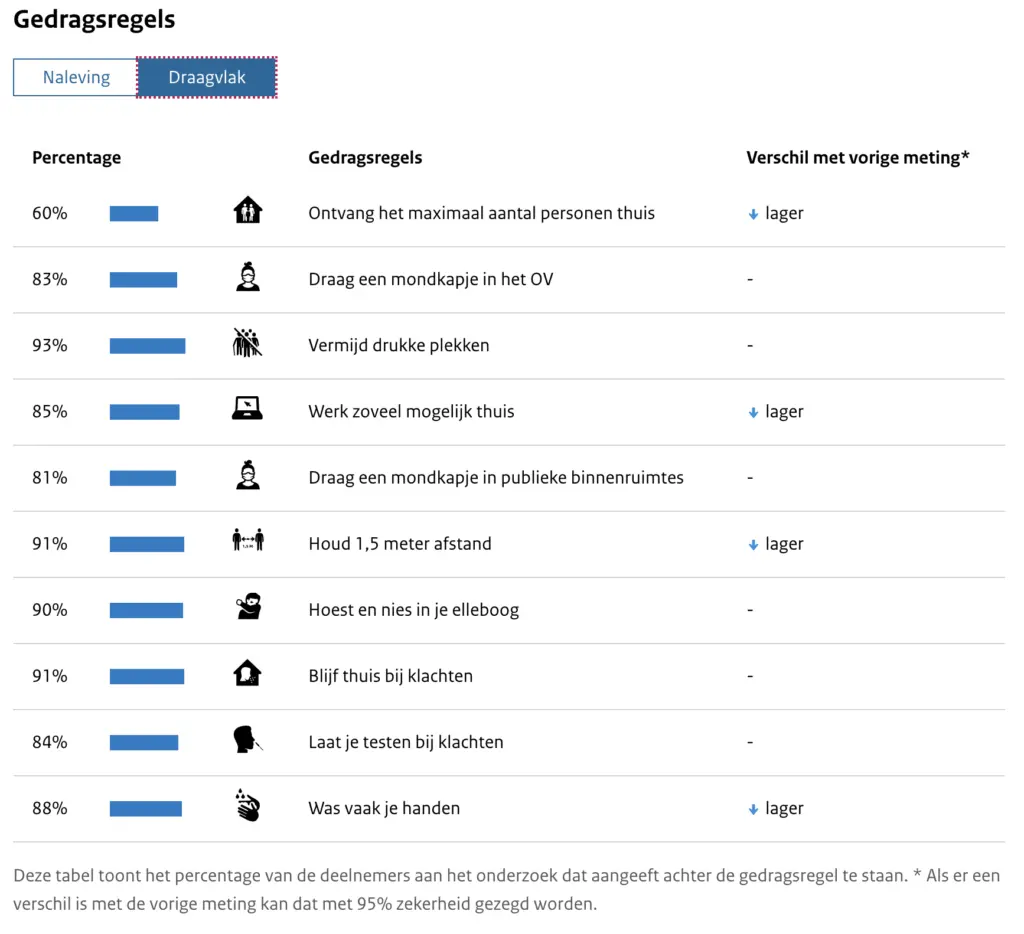 Over het algemeen is het draagvlak voor de maatregelen groot: het varieert van 81% tot 93%. Uitzondering is het ontvangen van een maximaal aantal personen thuis. Daarvoor is het draagvlak maar 60%.